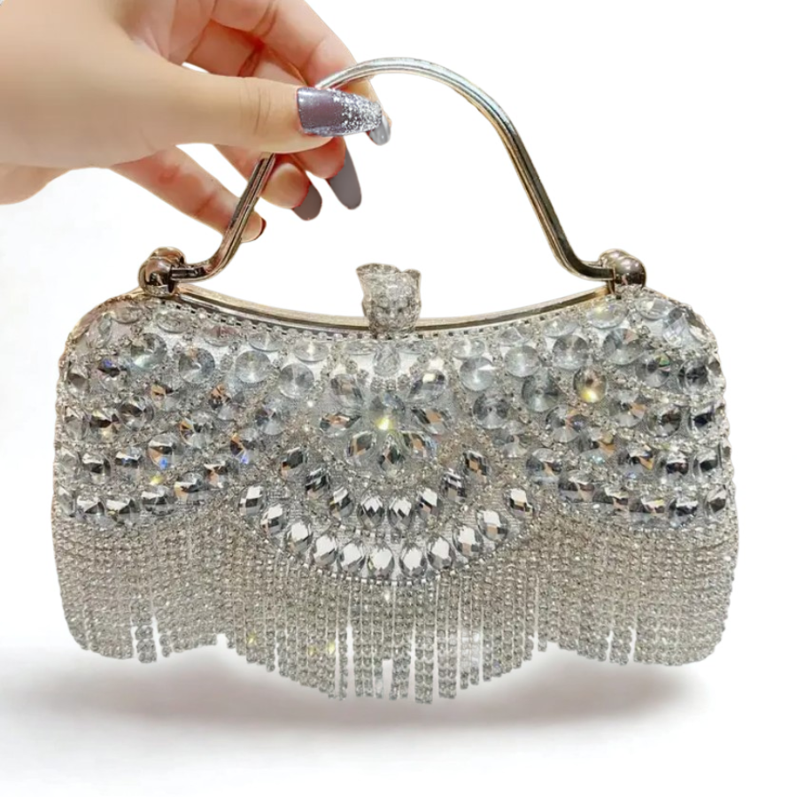 Tämä upea Art Deco Clutch tuo juhla-asuusi 1920-luvun eleganssia ja modernia säihkettä. Kristallien geometrinen kuviointi ja kiiltävät hapsut tekevät laukusta todellisen katseenvangitsijan. Laukku sopii täydellisesti erityisiin tilaisuuksiin, kuten häihin, cocktailjuhliin tai illallispukuihin.