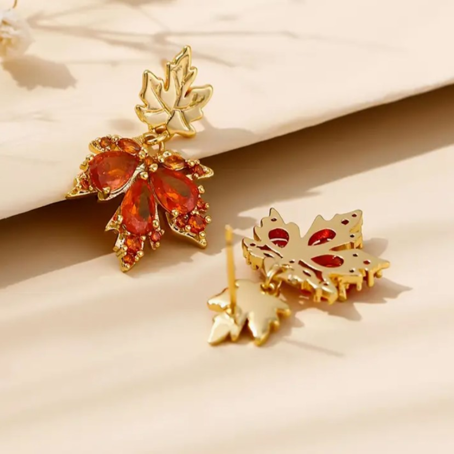Syksyn inspiroimat Autumn Maple -korvakorut hehkuvat lämpimissä sävyissä. Kullatusta messingistä valmistettu lehtimuotoilu yhdistyy säihkyviin oransseihin kiviin, luoden näyttävän ja elegantin ilmeen. Täydellinen valinta juhlaan tai arkeen!