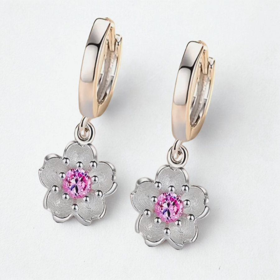 Korvakorujen suloiset kirsikankukkariipukset, joissa on säihkyvä vaaleanpunainen kristalli keskellä, tuovat ripauksen leikkisyyttä ja kevään raikkautta.