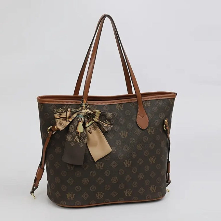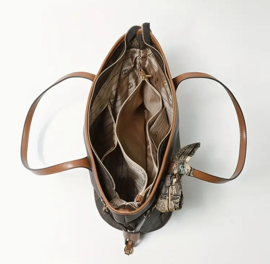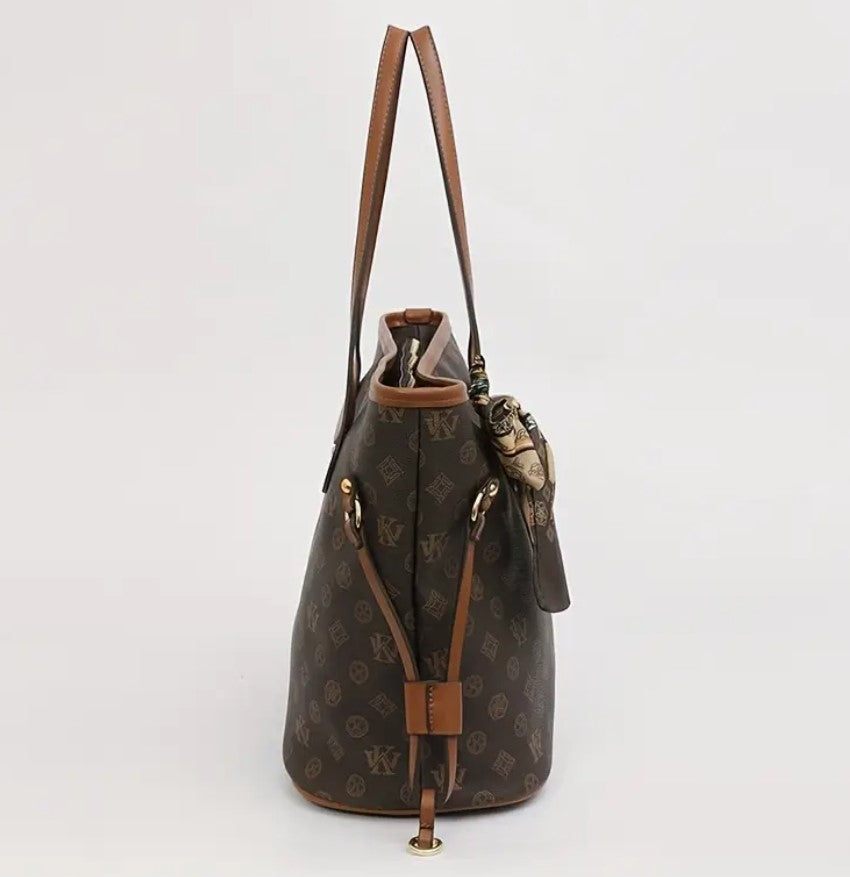 Claudia Tote -käsilaukku yhdistää tyylikkyyden ja käytännöllisyyden. Sen elegantti monogrammikuosi ja ruskeat nahkayksityiskohdat huokuvat ajattomuutta. Laukun ilmettä täydentää kaunis koristeellinen huivi, joka tuo uniikkia charmia. Tilava sisäosa tekee siitä täydellisen kumppanin arjen tarpeisiin, ja pitkät kahvat takaavat mukavan kantokokemuksen. Loistava valinta modernille ja tyylitietoiselle naiselle!