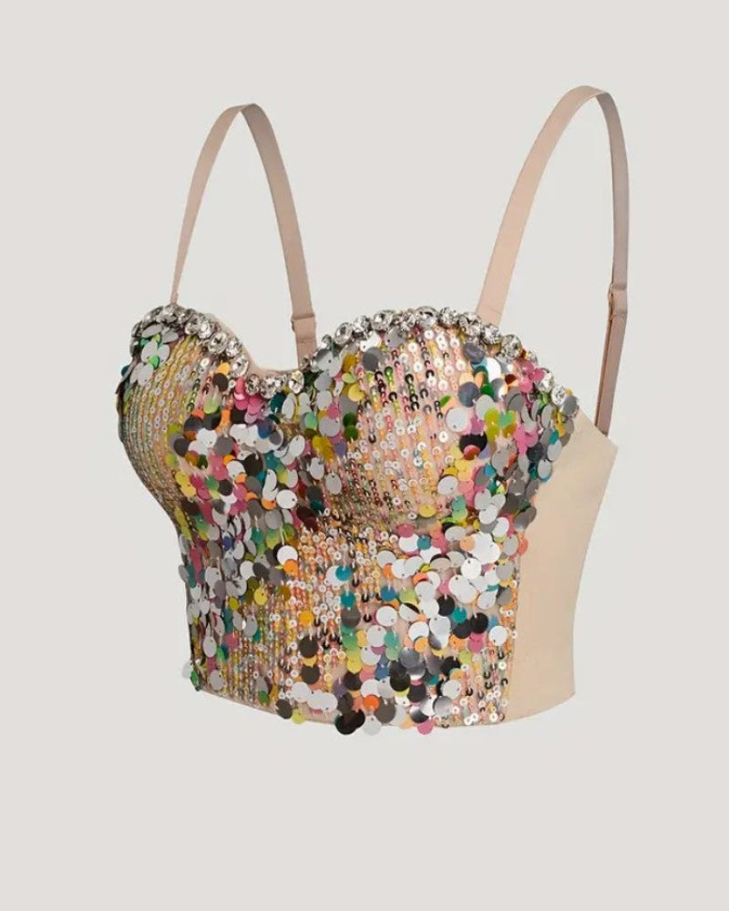 Confetti korsetti on todellinen katseenvangitsija, joka tuo juhliin säihkettä ja iloa. Sen värikkäät paljettikoristeet ja kimaltavat yksityiskohdat luovat näyttävän ja rohkean ilmeen. Säädettävät olkaimet takaavat mukavan istuvuuden, kun taas korsetin muotoilu korostaa vartalon kauniita linjoja. Täydellinen valinta juhlatilaisuuksiin, kun haluat erottua edukseen!