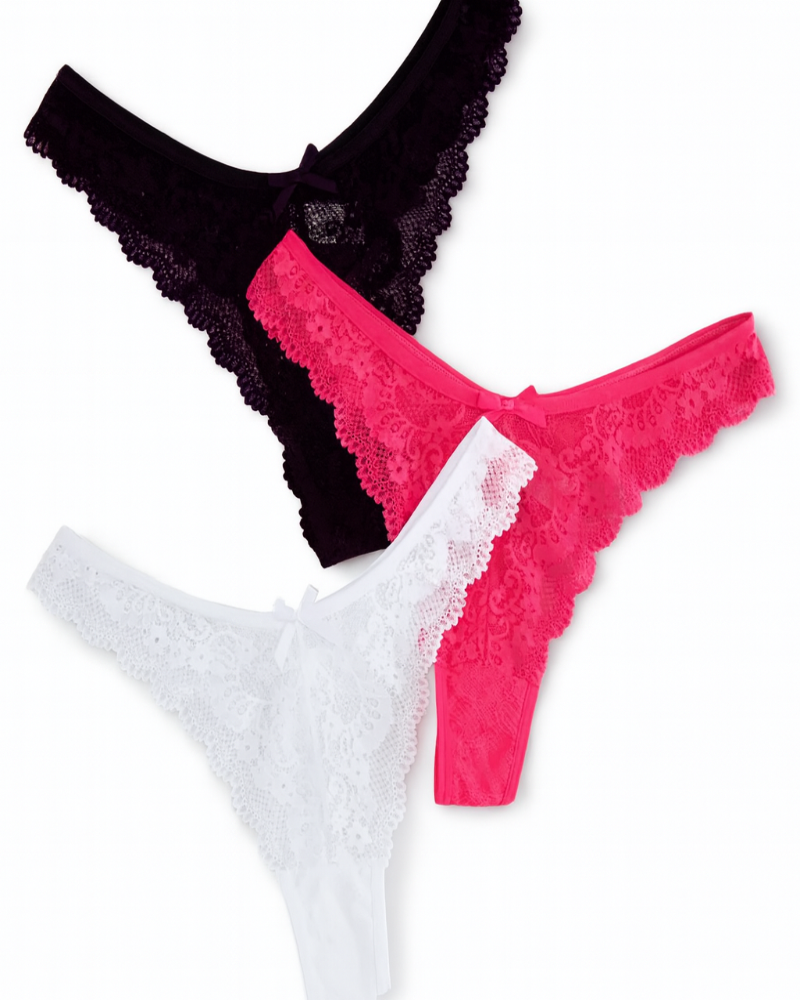 Hurmaava Evelyn-stringisetti sisältää kolme kaunista pitsistringiä eri väreissä: klassinen musta, raikas valkoinen ja rohkea pinkki. Täydellinen yhdistelmä mukavuutta ja naisellista eleganssia jokapäiväiseen käyttöön!