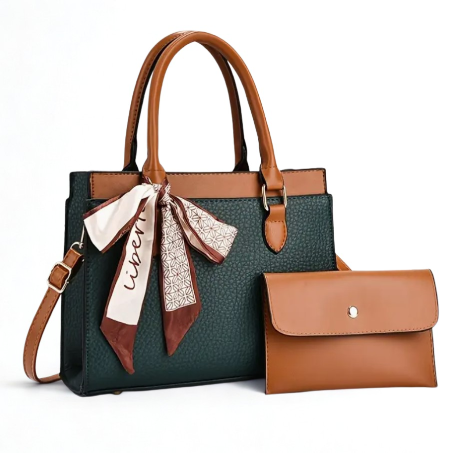 Felicity-laukkusetti tarjoaa täydellisen yhdistelmän tyyliä ja käytännöllisyyttä. Tumma vihreä ja konjakinruskea väriyhdistelmä huokuu eleganssia, kun taas mukana tuleva huivi lisää ripauksen persoonallisuutta. Settiin kuuluu tilava käsilaukku ja kätevä pikkulaukku, jotka sopivat sekä arkeen että juhlaan. Täydellinen kumppani kaikille tyylitietoisille!