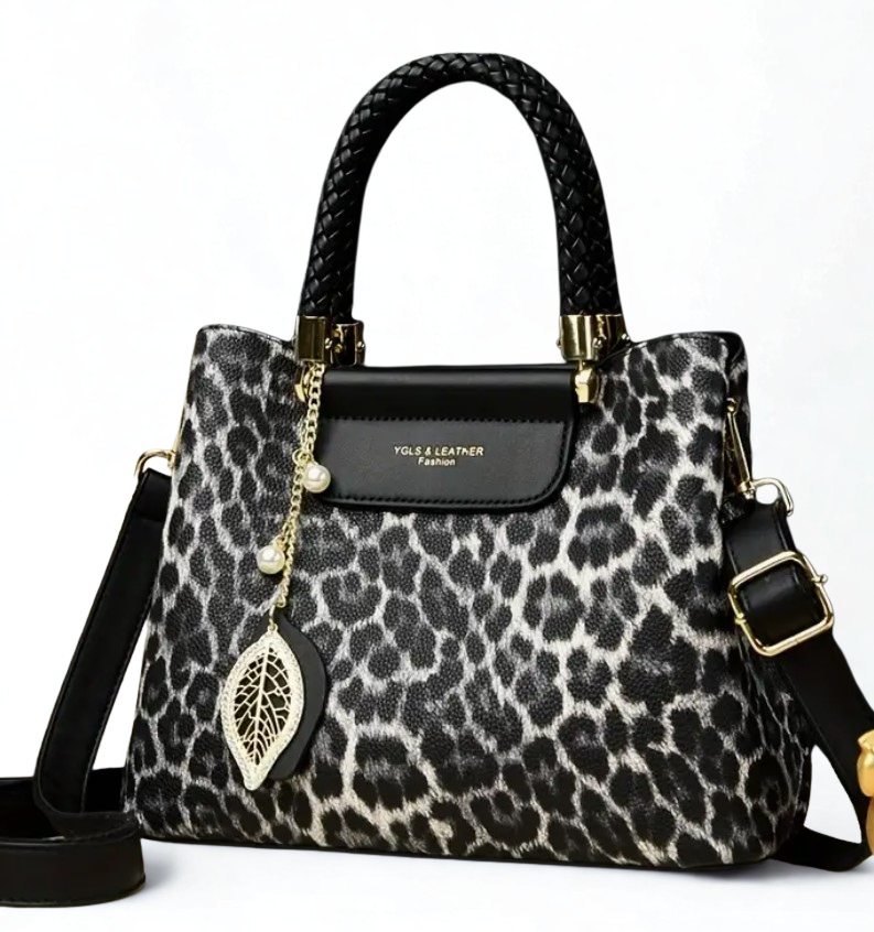 Tämä Feline Käsilaukku on täydellinen valinta sinulle, joka haluat tuoda asuusi ripauksen villiä eleganssia. Leopardikuvio ja laadukkaat mustat yksityiskohdat yhdistyvät ajattomaan muotoiluun, joka sopii niin työpäivään kuin iltamenoihin. Koristeellinen kultainen lehtiriipus ja helmiyksityiskohdat viimeistelevät laukun ylellisen ilmeen.