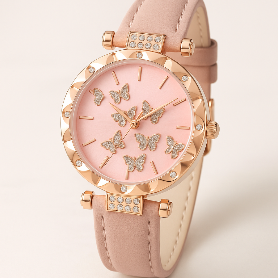 Tämä kaunis perhosaiheinen rannekello yhdistää täydellisesti tyylin ja toiminnallisuuden. Kellotaulua koristavat kimaltavat perhosyksityiskohdat, jotka huokuvat keveyttä ja eleganssia. Vaaleanpunainen kellotaulu ja ruusukultaiset yksityiskohdat luovat harmonisen ja ylellisen ilmeen.