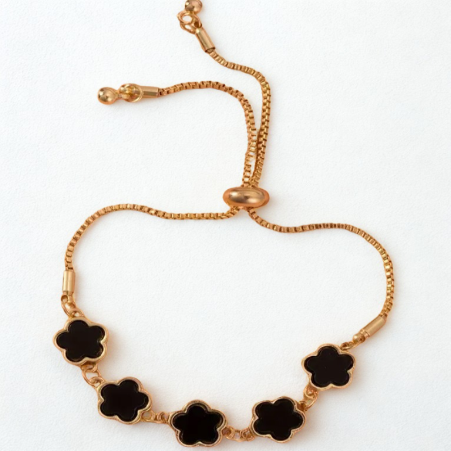 Peggy rannekoru on täydellinen yhdistelmä klassista muotoilua ja modernia kauneutta. Kullatun ketjun ja mustien kukkakoristeiden kontrasti luo tyylikkään ja monikäyttöisen asusteen, joka sopii niin arkeen kuin juhlaan.