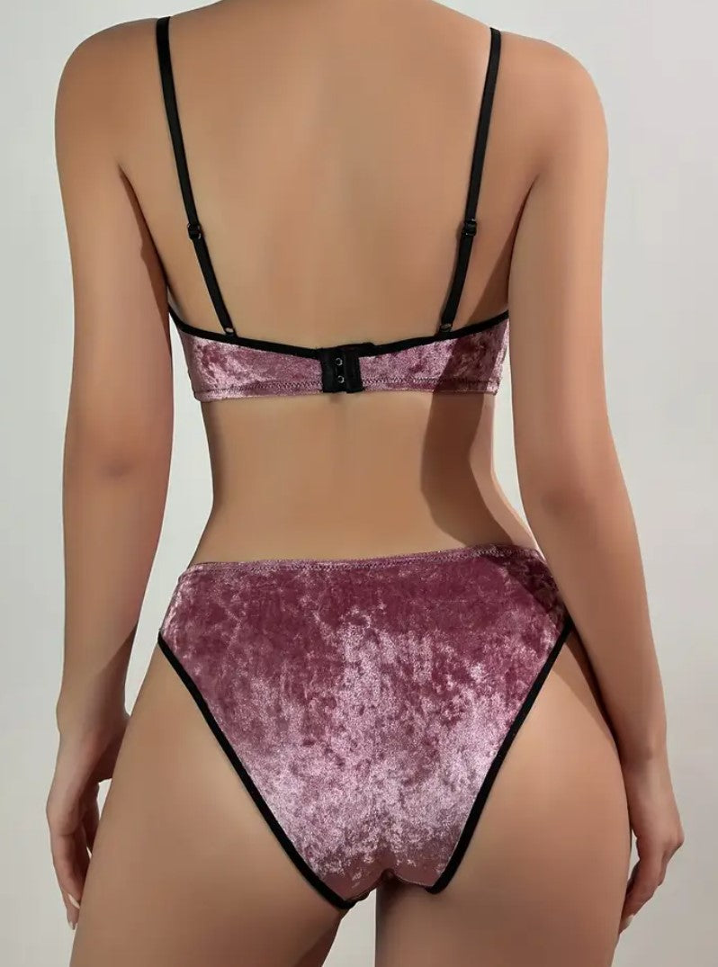 Rapunzel alusvaatesetti – Ylellistä samettia ja viettelevää mukavuutta. Hemmottele itseäsi tällä söpöllä setillä, jossa samettinen materiaali ja syvä viininpunainen sävy huokuvat ylellisyyttä. Mustat kontrastiyksityiskohdat ja suloiset rusetit täydentävät setin romanttisen ja elegantin ilmeen. Täydellinen yhdistelmä mukavuutta ja glamouria.