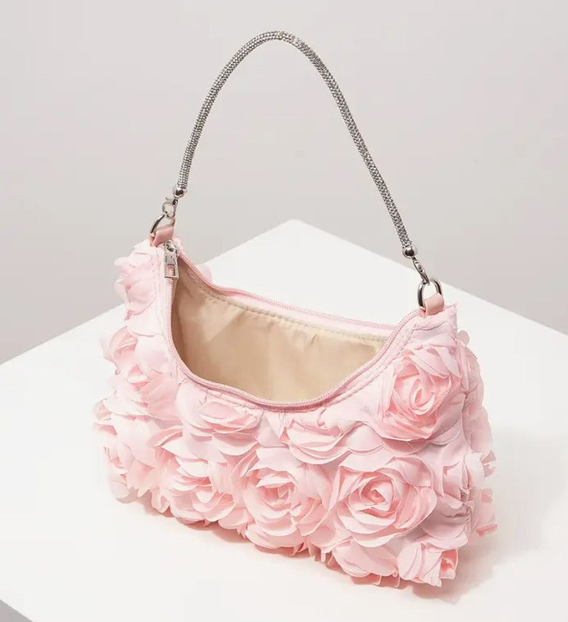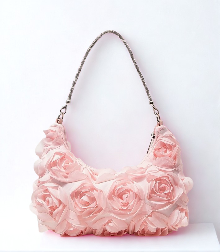 Tämä upea vaaleanpunaisilla ruusukoristeilla viimeistelty Sleeping beauty -laukku on täydellinen yhdistelmä romantiikkaa ja käytännöllisyyttä. Sen herkkä design ja huolitellut yksityiskohdat tekevät siitä täydellisen lisän niin juhliin kuin arjen tyylikkäisiin hetkiin. Hopeinen kahva tuo laukkuun ripauksen ylellisyyttä ja tekee siitä elegantin valinnan.